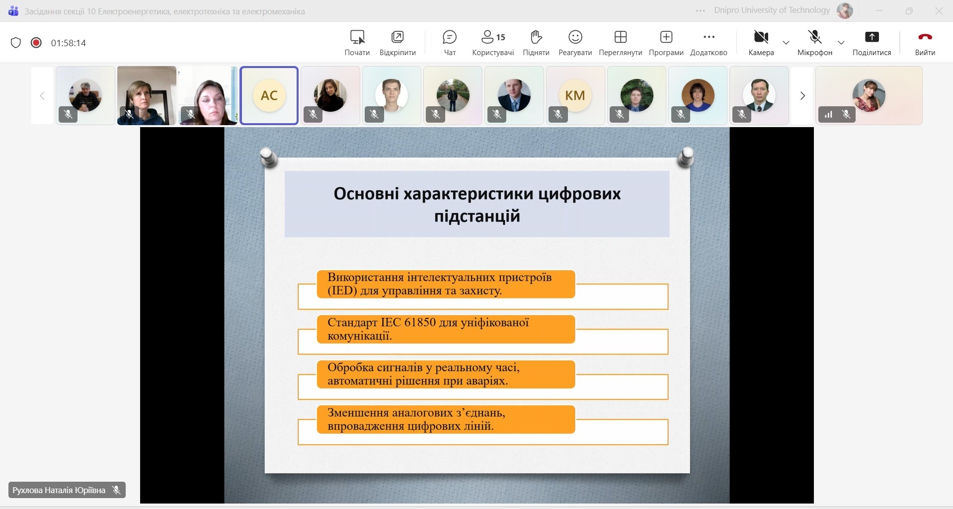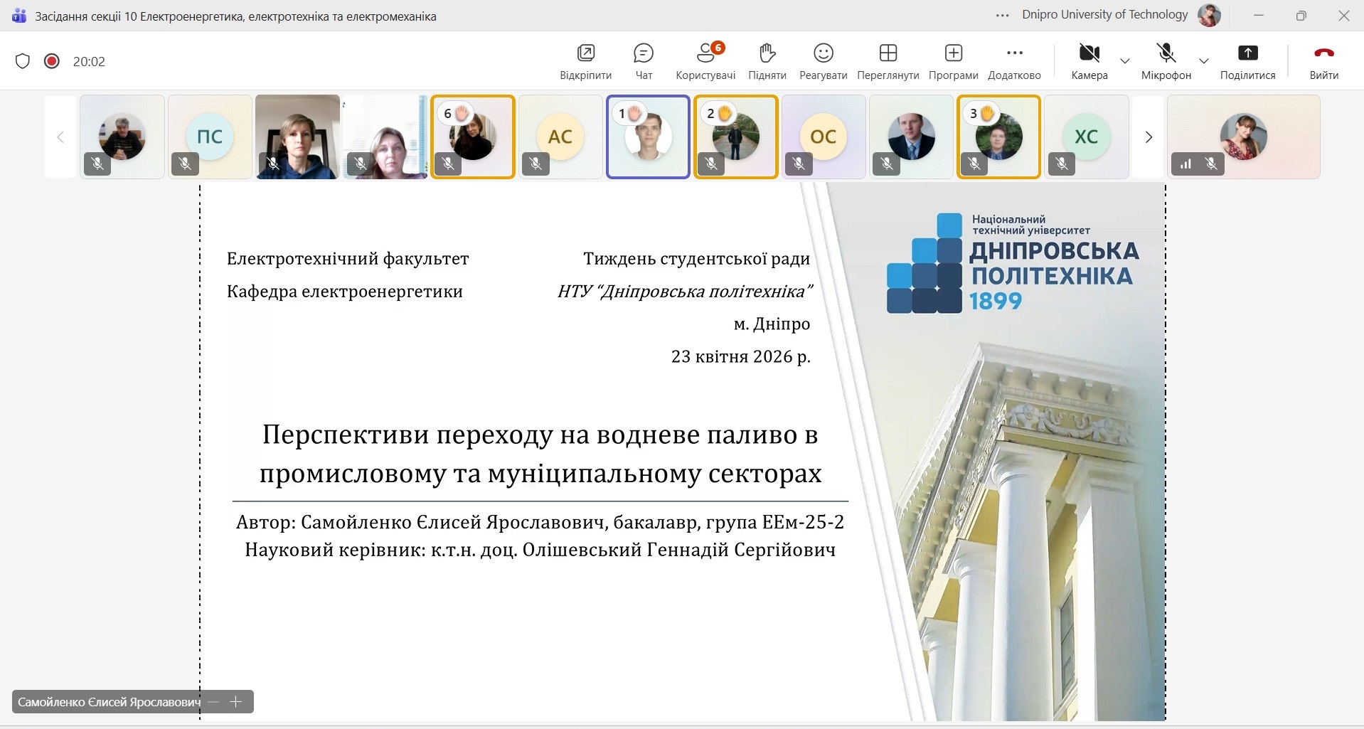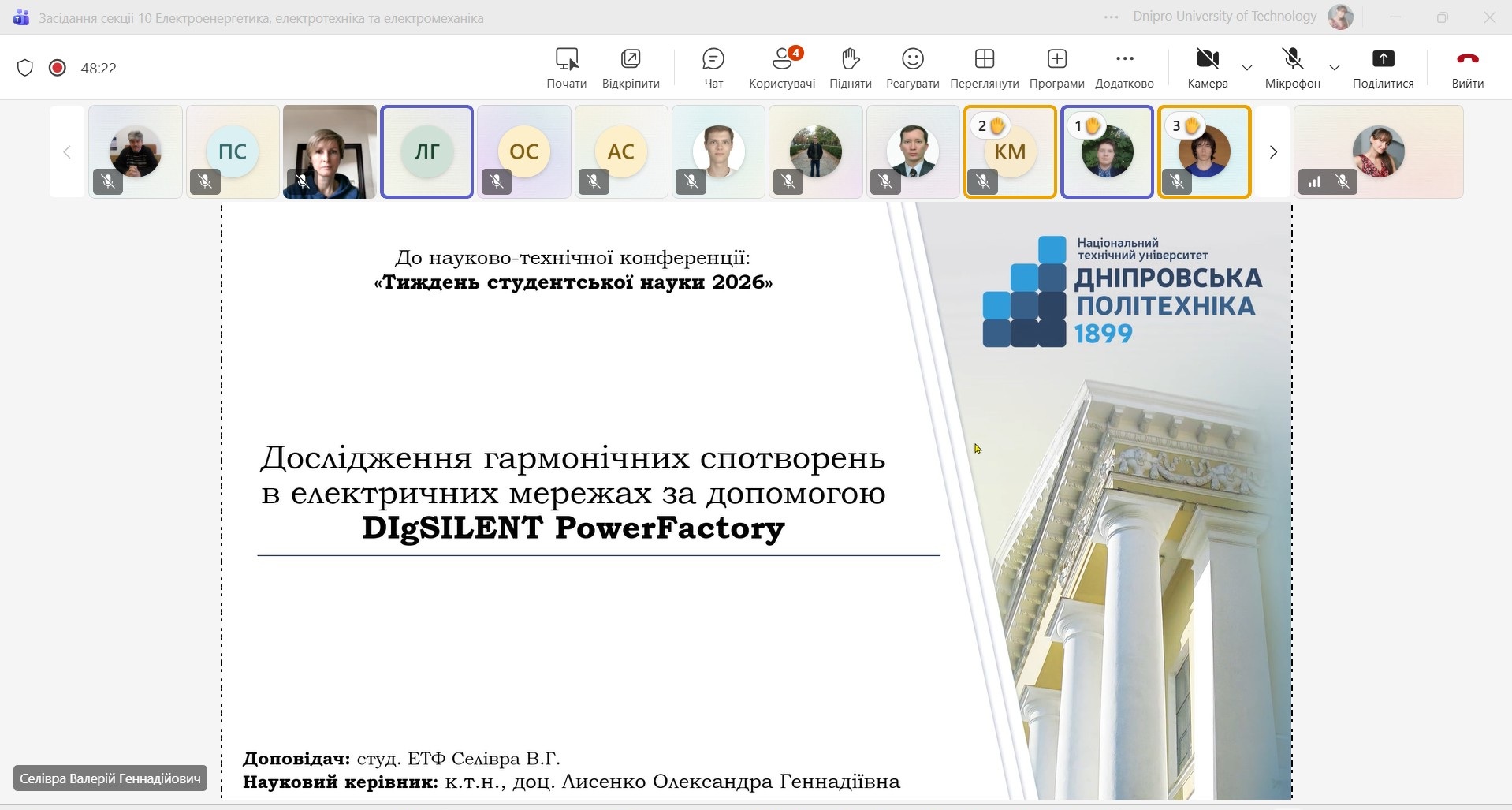 23 квітня відбулося засідання секції 10 «Електроенергетика, електротехніка та електромеханіка» в рамках студентської науково-технічної конференції «Тиждень студентської науки - 2026», яка проводилась у дистанційному (онлайн) режимі. Керівник секції – Лисенко Олександра Геннадіївна, к.т.н., доцент кафедри електропривода, секретар секції – Рухлова Наталія Юріївна, к.т.н., доцент кафедри електроенергетики.
